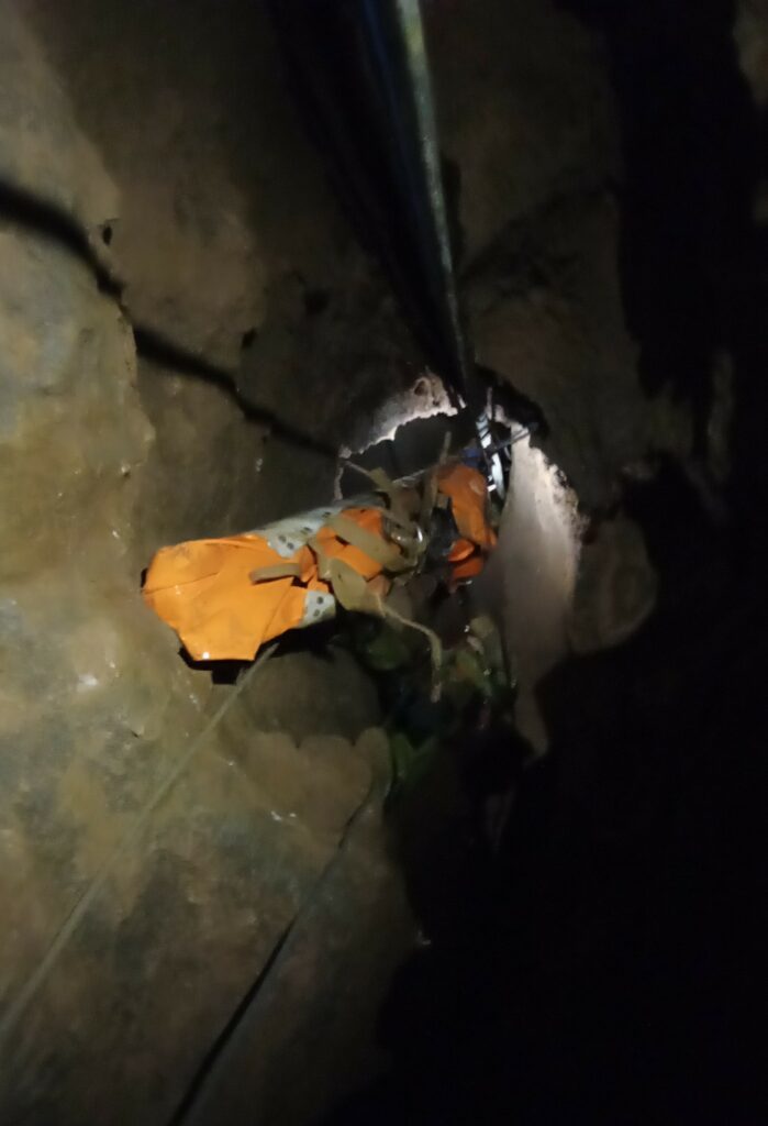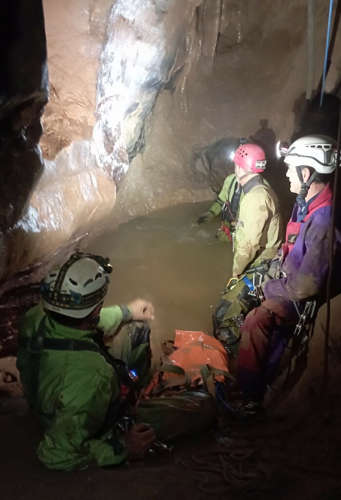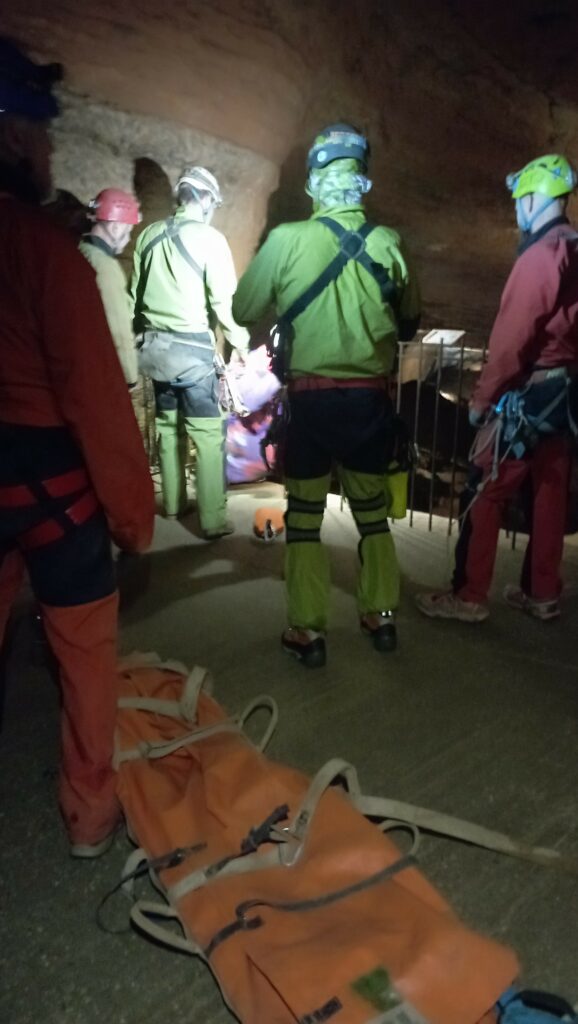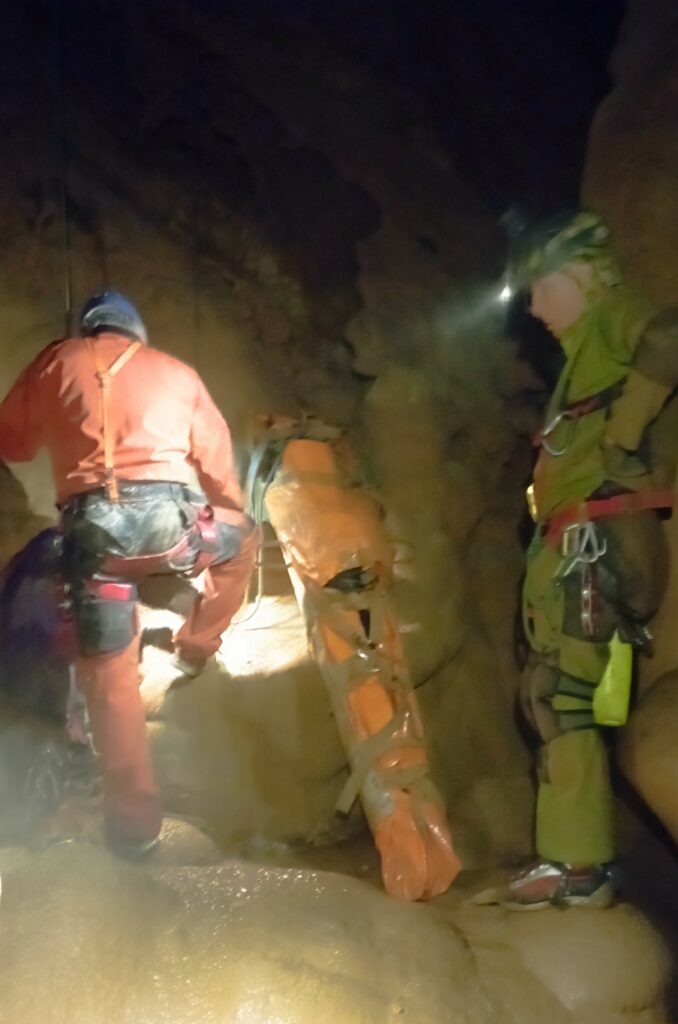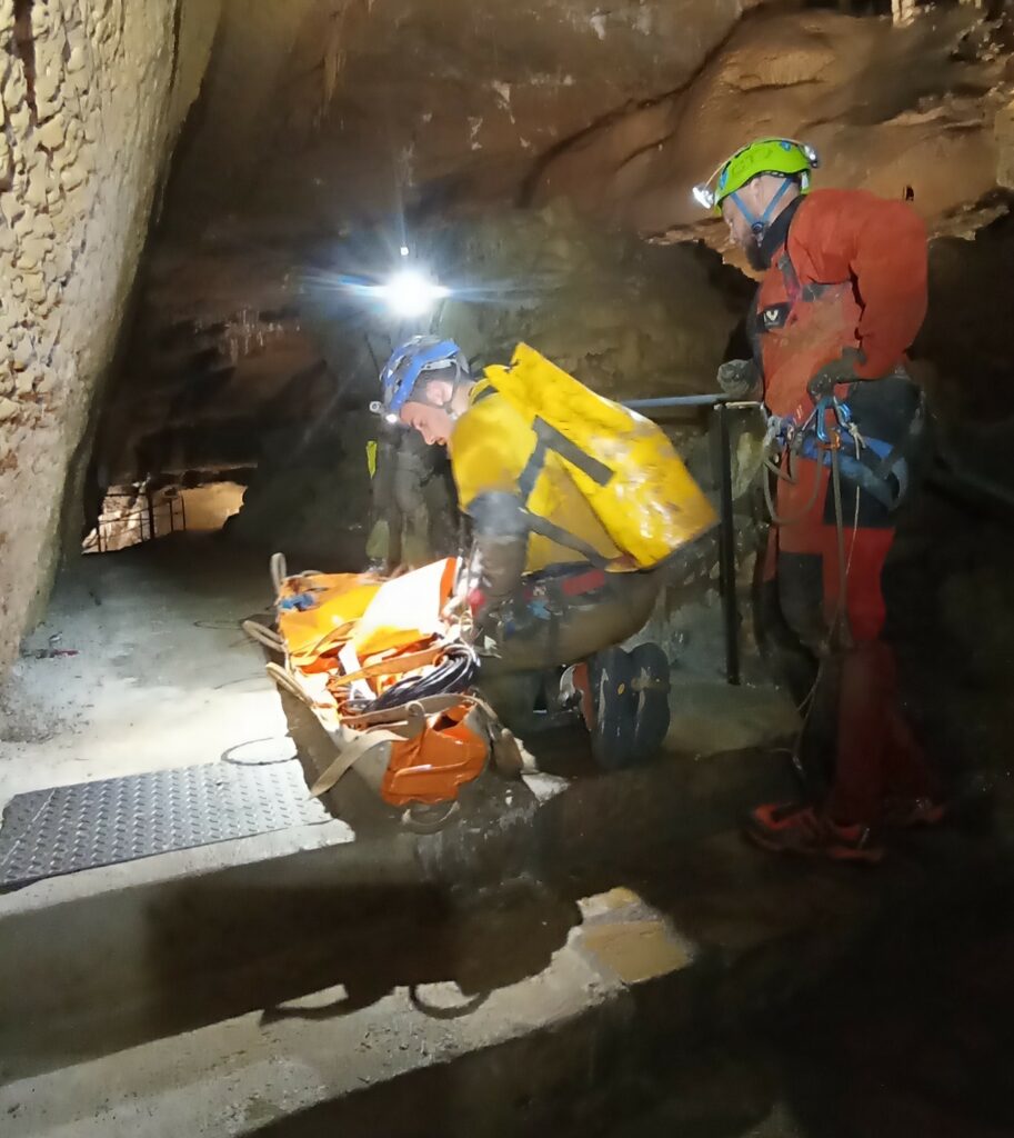 Point de blessé, le Spéléo Secours n’a pas été impliqué… et pourtant il a fallut deux civières pour remonter des pompes de la grotte.